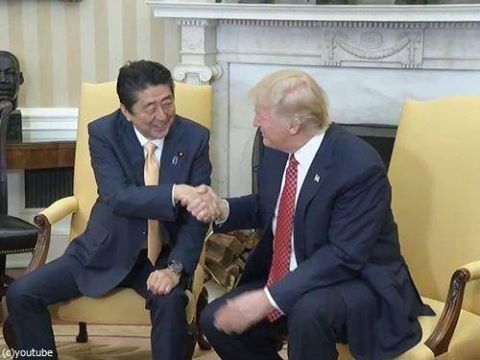 然後,安倍又策劃了一場高爾夫球外交。2月初飛到美國,又見了川普一面。不知道包了多少紅包,被握手握19秒整個被電到。