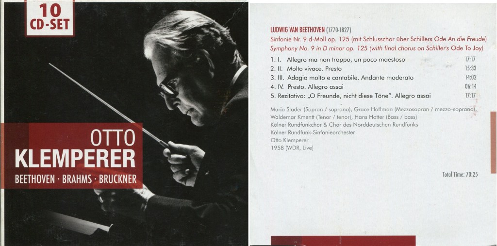 由於手上有克氏五個版本錄音(56、57、58、61、64),想尋找晚年緩慢風格的第九。比較九個版本後,發現1970年版控制力已經不若以往精準,有些遺憾,不過也因此注意到克倫培勒就如同其他同年代大師,現場版錄音才能真正感受老大師的功力。過去收集EMI版錄音幾乎都是錄音室版,總覺得聲音雖美,卻缺少了些許生氣。在比較的過程裡一邊聽其他曲目錄音,更加深刻認識到克氏的現場演奏聲音雖不如錄音室乾淨完美,卻有無可取代的現場張力。