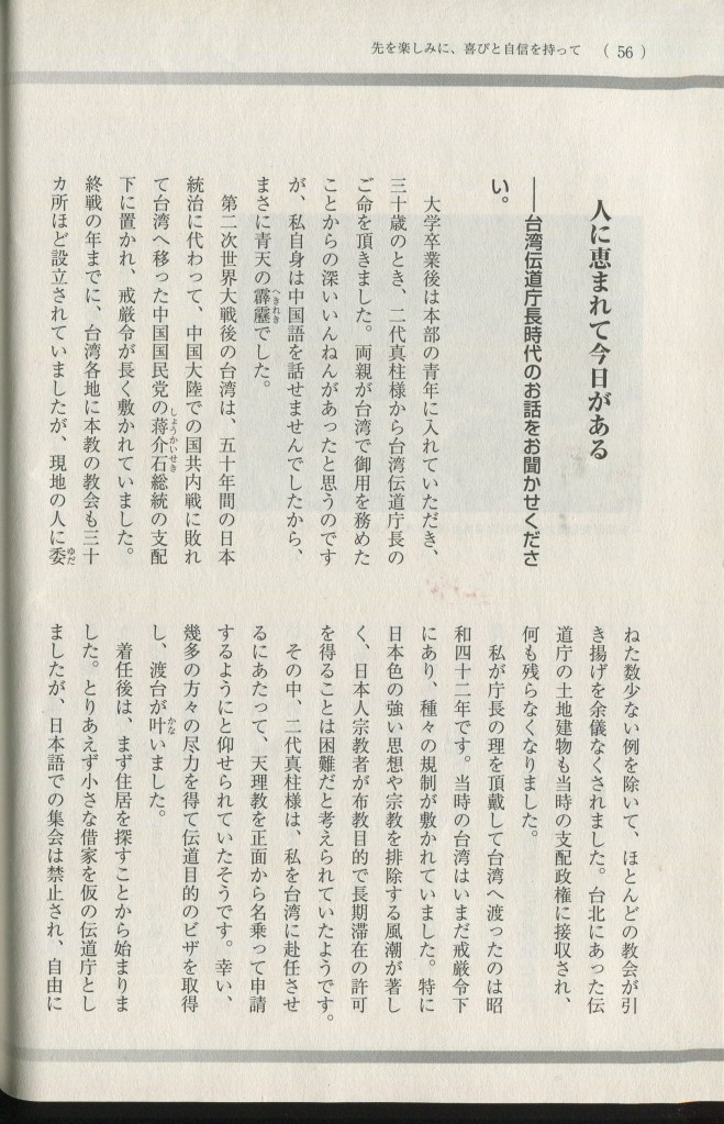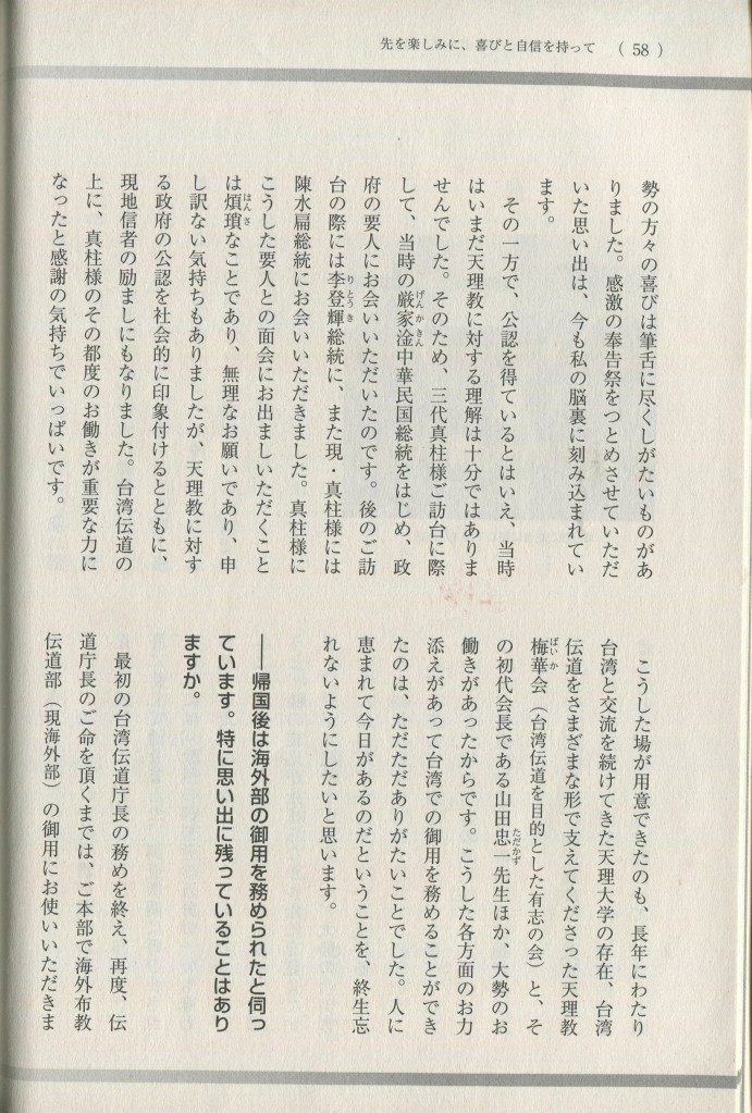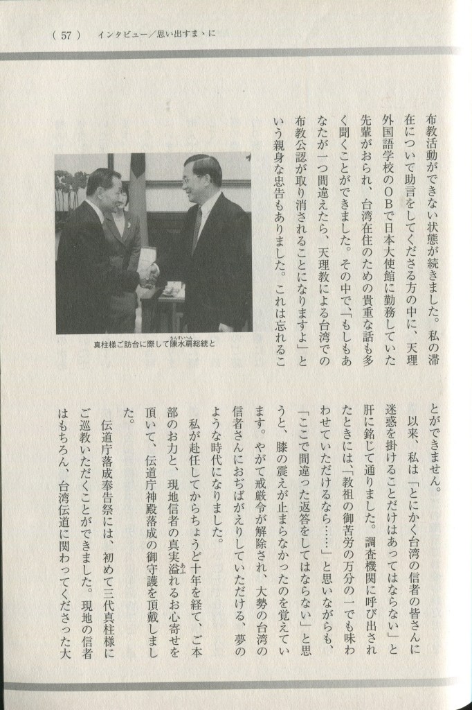 另一方面,雖然得到公認,但當時對天理教的理解仍然不夠。因此,在三代真柱先生訪台之際,以當時的嚴家淦中華民國總統為首,與政府要員進行會面。之後真柱先生在訪台之際與李登輝總統會面,現在的真柱先生與陳水扁總統會面。真柱先生與這些重要人士會面的事情很繁瑣,既是無理的請求,也帶著抱歉的心情,但對於帶給社會天理教得到政府公認的印象,也可以激勵現地信者。真柱先生每次來訪對於台灣傳道都是重要的力量,我充滿感謝。