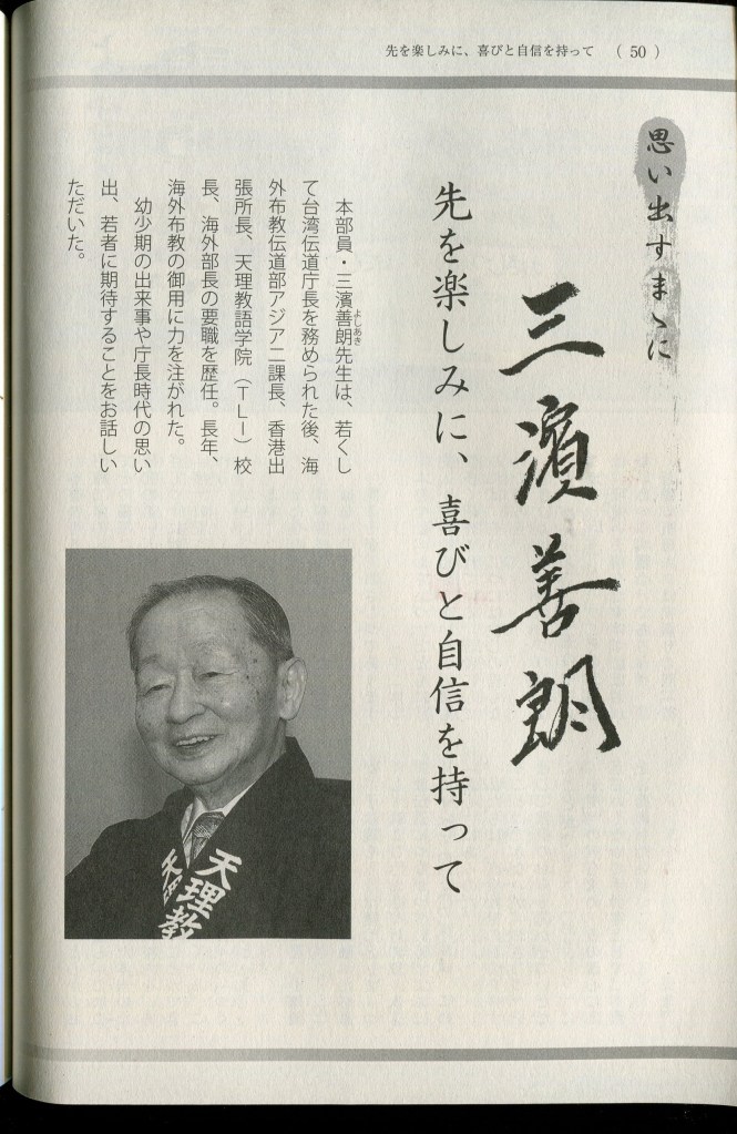本部員三濱善朗先生,年輕時擔任台灣傳道廳長,歷任海外佈教傳道部亞洲二課長、香港出張所長、天理教語學院(TLI)校長、海外部長等要職。長年致力於海外佈教的神務。