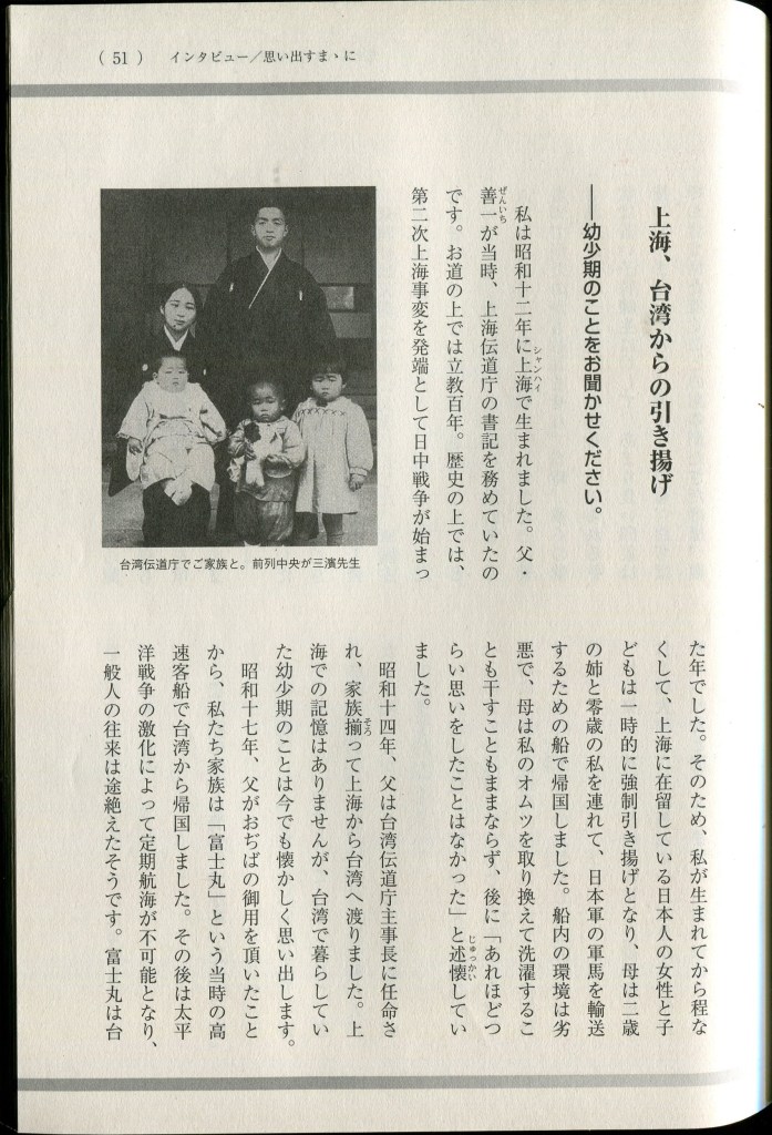我昭和十二年(1937年)在上海出生。父親善一當時擔任上海傳道廳書記。此時天理之道正值立教百年。歷史上是由發生第二次上海事變而開始的日中戰爭。因此,我出生後不久,居留在上海的日本人女性及小孩被暫時強制遣返,母親帶著兩歲的姐姐及零歲的我,乘坐輸送日本軍軍馬的船回國。船內的環境惡劣,母親要換我的尿布、清洗曬乾都沒辦法,日後在述懷時說「沒有碰過這麼難受的事情」。