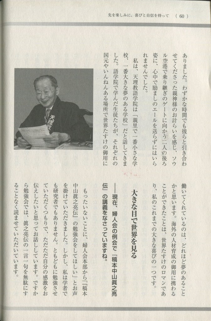 我認為學習真之亮傳最重要的事情是不單把史實當作過去發生的事,而是把從中吸收到的東西,活用成為當今活著的我們的心靈支柱。我想,如果能學習初代真柱先生為一派獨立長年的苦心、放眼將來而成立天理教校的遠大志向,就會獲得力行天理之道的氣概,致力拯救的力量。