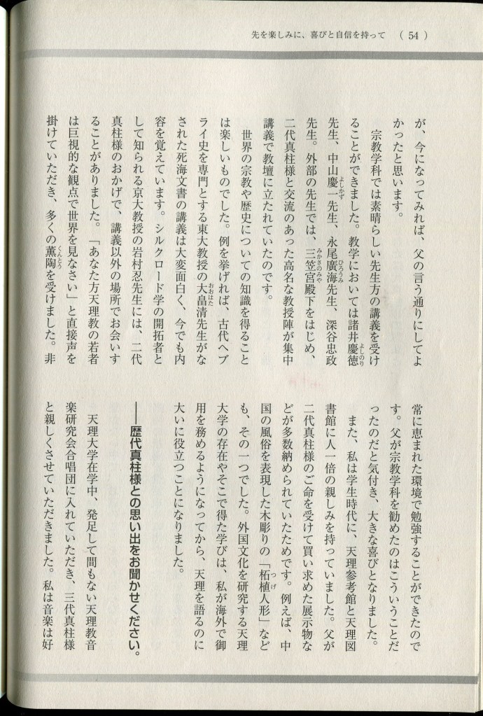 我很高興能學到世界宗教以及歷史相關的知識。舉例來說,專政古代希伯來史的東大教授大畠清老師的死海文書講義非常有意思,我現在還記得內容。以絲路學的開拓者聞名的京大教授岩材忍老師,託二代真柱的福,得以在講義以外的場所與老師會面。他直接跟我說「你們天理教的年輕人要用巨視的觀點去看世界」,讓我獲得很多薰陶。我在非常良好的環境下學習。這就是父親勸我念宗教學科的理由啊,我發現這件事情時相當高興。