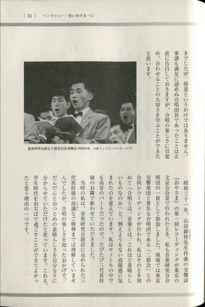 昭和三十一年(1956年),山田耕筰先生作曲的交響詩「おやさま(教祖)」第一次錄音在東京文京公會堂舉行,身為音樂研究會合唱團的成員我也參加了。現場與東京交響樂團及著名的合唱團「二期會」進行共同錄音,我當時第一次感到「合唱,音樂,是多麼美妙的事情啊」,記得我被無法言喻的高揚感所包圍。我唱的是高音當中的高音部,經常在三代真柱的旁邊唱歌。