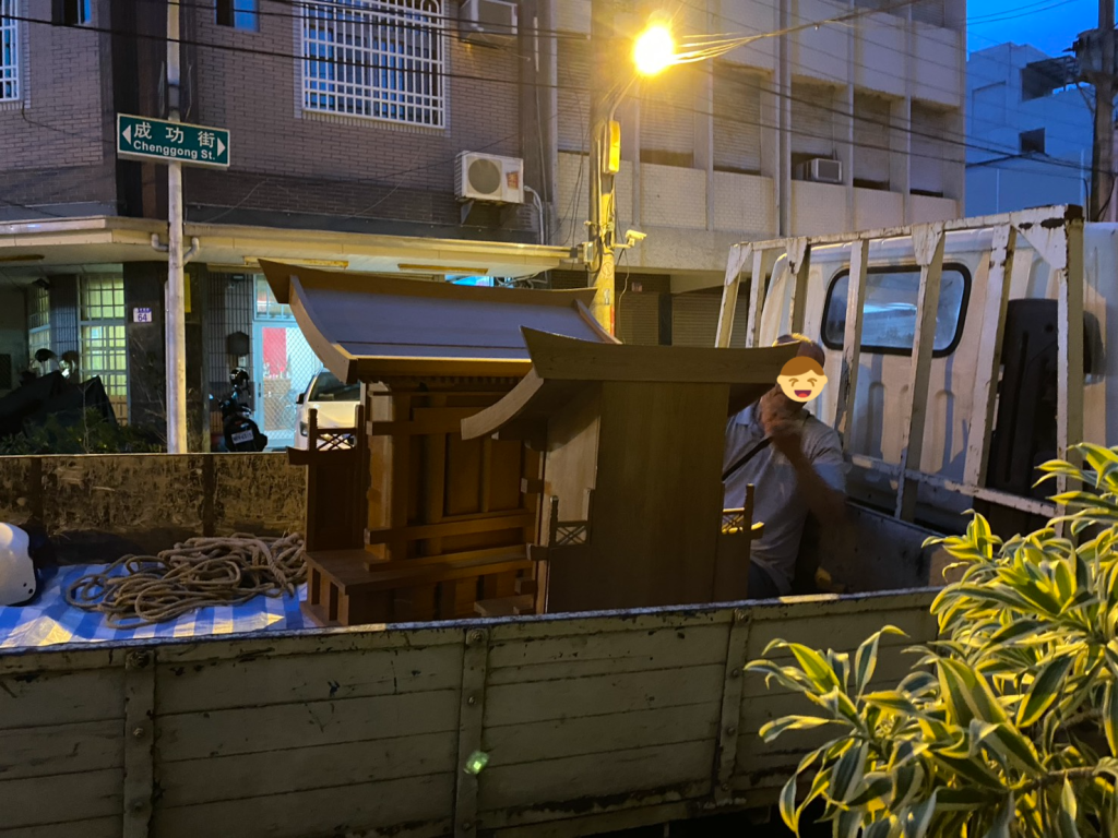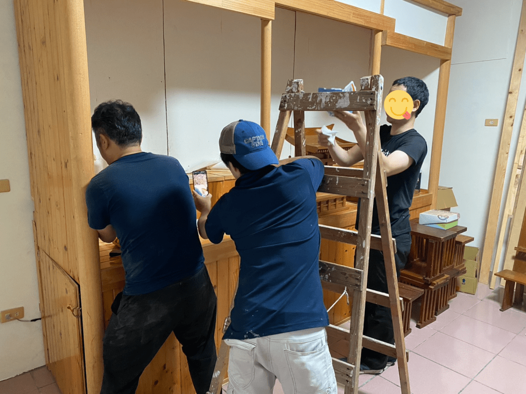 5月28日上級會長一行人如期前來花蓮,加上花蓮台北台中來幫忙的教友、朋友一共15人一起聖勞。29日起原本氣象預報會有大雨,很幸運的當天早上順利把樂器及神具載完,第3趟車載一般家具才下起毛毛雨,中午過後雨勢才變大,下午就在室內進行神殿分解及整理。30日是陰晴交錯的好天氣,首先將分解好的神殿載去新教會組裝,後續所有家具也在天黑前完成搬運,傍晚在上級會長護送下,把最後一車物品-神龕搬到新教會。